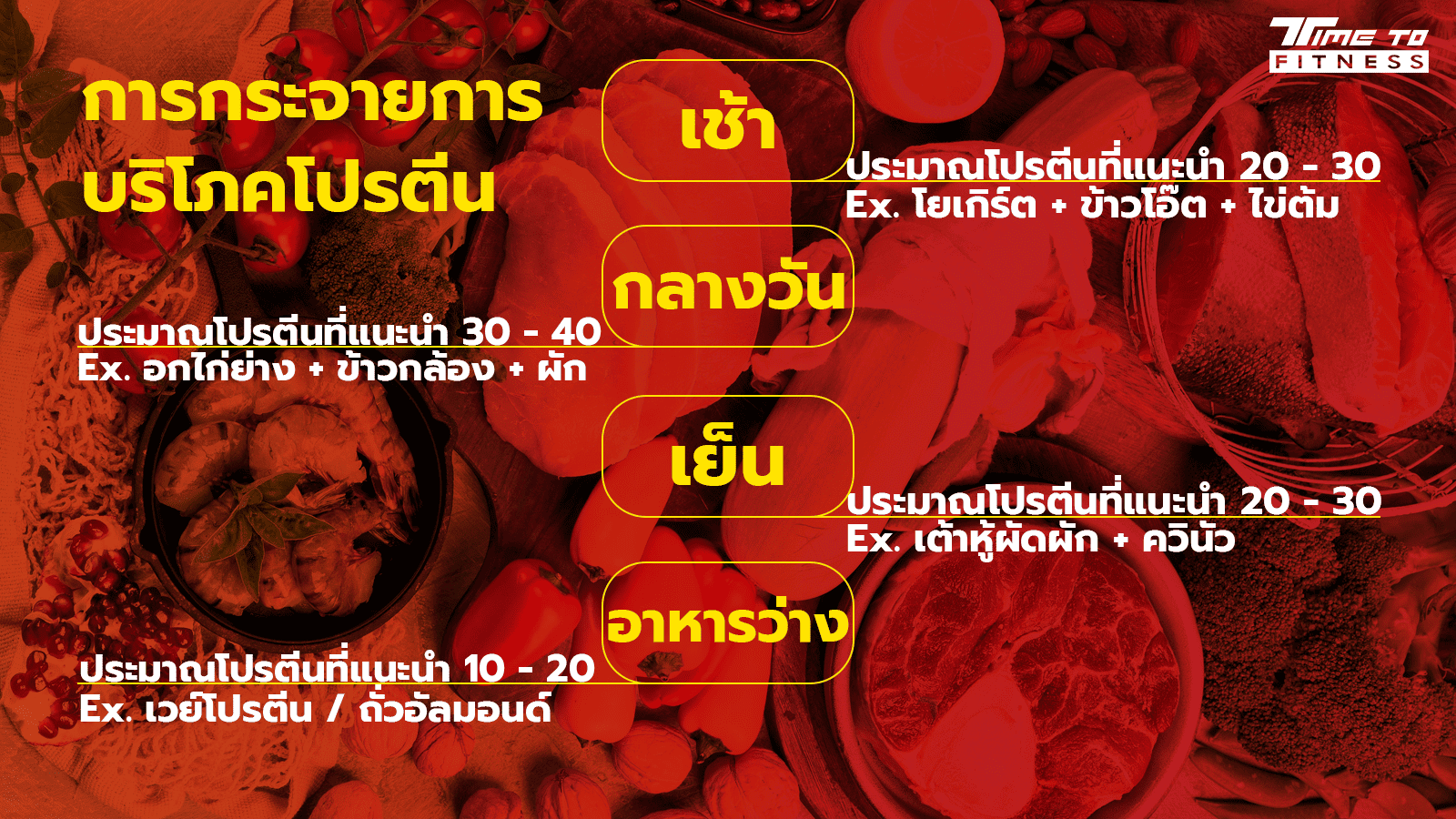 ควรแบ่งโปรตีนให้กระจายไปตลอดทั้งวัน เช่น มื้อเช้า กลางวัน เย็น เพื่อช่วยในการดูดซึมและการสร้างกล้ามเนื้ออย่างมีประสิทธิภาพ