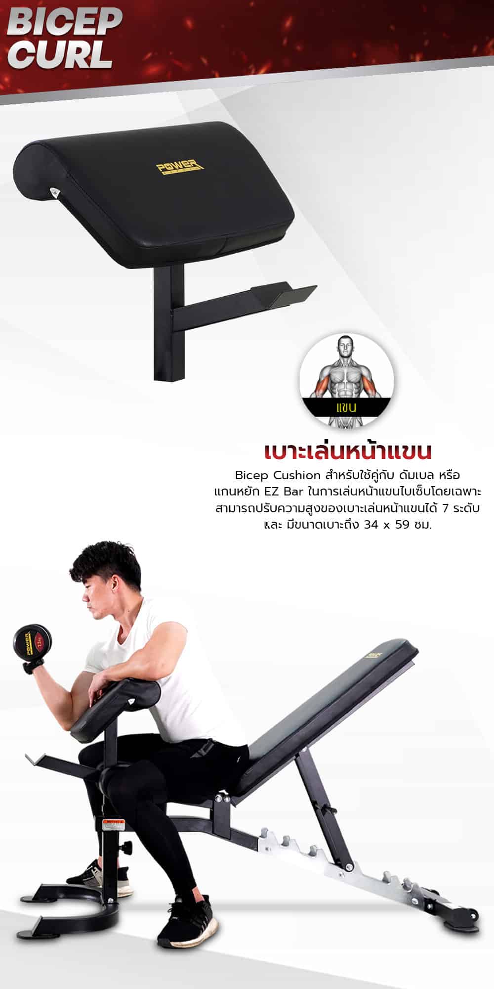 เบาะเล่นหน้าแขน Bicep Cushion อุปกรณ์เสริมของเก้าอี้ยกน้ำหนัก POWER IRON สำหรับใช้คู่กับ ดัมเบล หรือ แกนหยัก EZ Bar ในการเล่นหน้าแขนไบเซ็บโดยเฉพาะ สามารถปรับความสูงของเบาะเล่นหน้าแขนได้ 7 ระดับ และมีขนาดเบาะถึง 34 x 59 ซม.