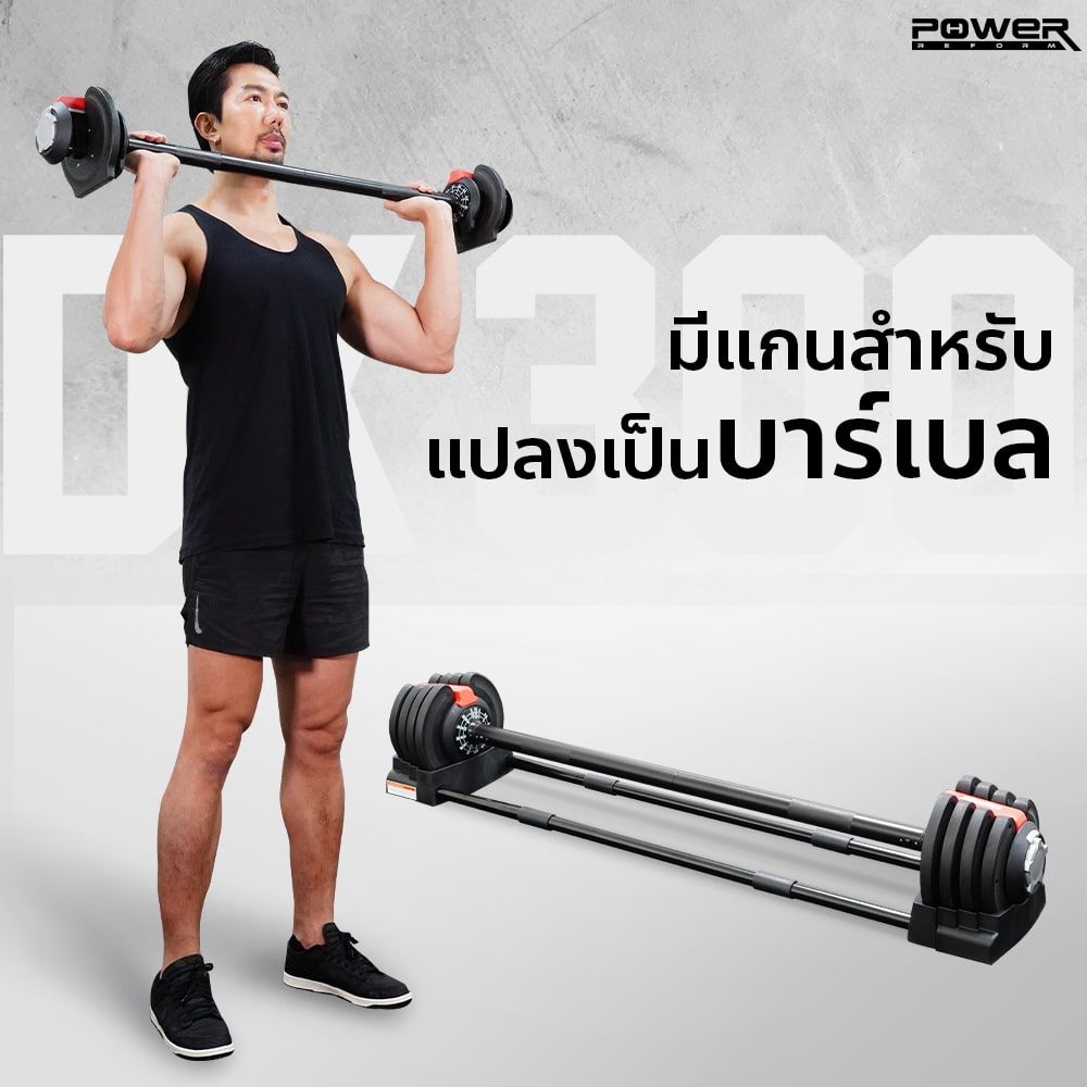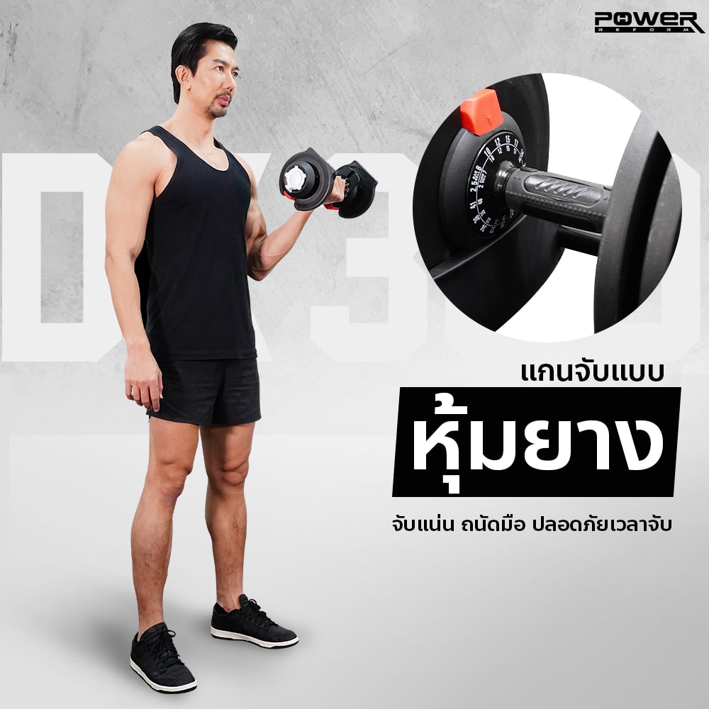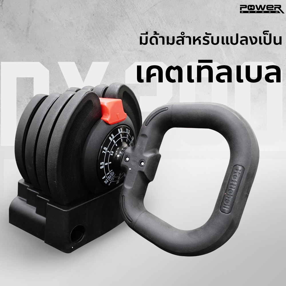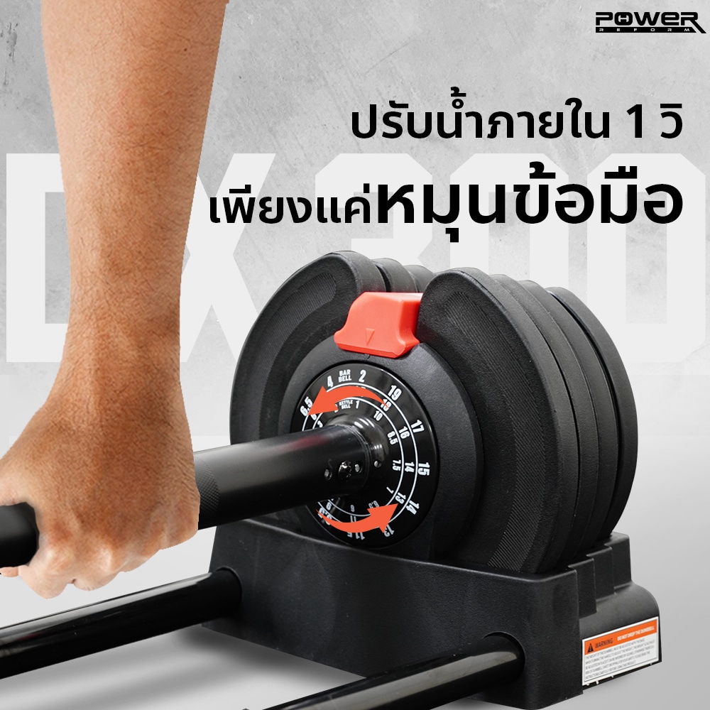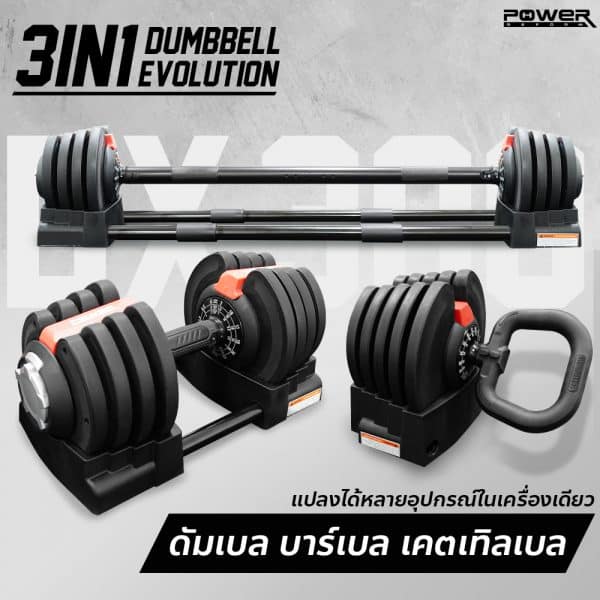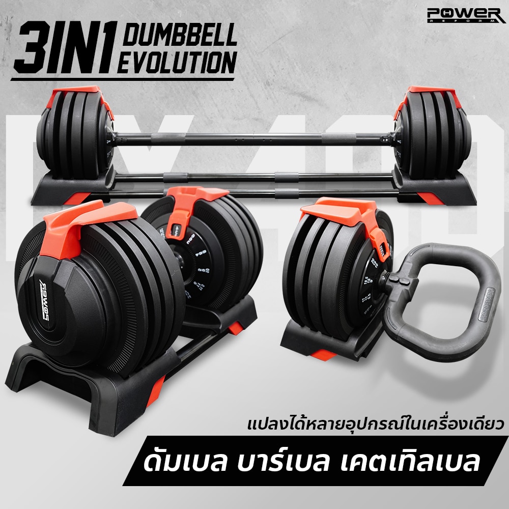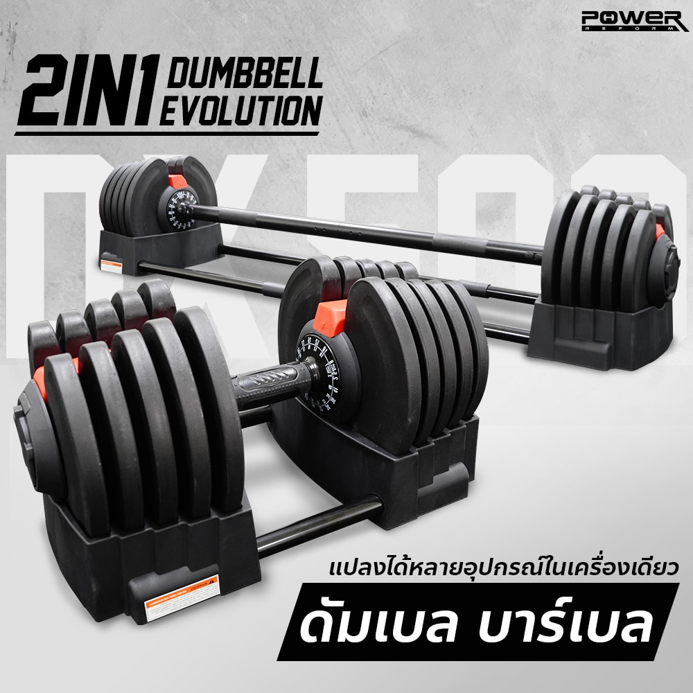 ดัมเบลปรับน้ำหนัก Evolution รุ่น DX-300/400/500 จาก Power Reform 3 in 1 ดัมเบล,บาร์เบล,เคตเทิลเบล มีแกนต่อสำหรับแปลงเป็นบาร์เบล มีด้ามจับ สำหรับแปลงเป็น kettlebell แกนจับบาร์เบลเป็น Diamond cut จับแน่นถนัดมือ แกนจับดัมเบลหุ้มยาง จับถนัดมือ ปลอดภัยเวลาจับ ผลิตจากเหล็กเคลือบด้วยพลาสติกคุณภาพสูงช่วยป้องกันสนิม ลดเสียงรบกวนขณะออกกำลังกาย ประหยัดพื้นที่มีให้เลือกถึง 3 รุ่น DX-300 ปรับน้ำหนักได้ถึง 19 กก. รวมบาร์เบล DX-400 ปรับน้ำหนักได้ถึง 24 กก. รวมบาร์เบล DX-500 ปรับน้ำหนักได้ถึง 24 กก. รวมบาร์เบล