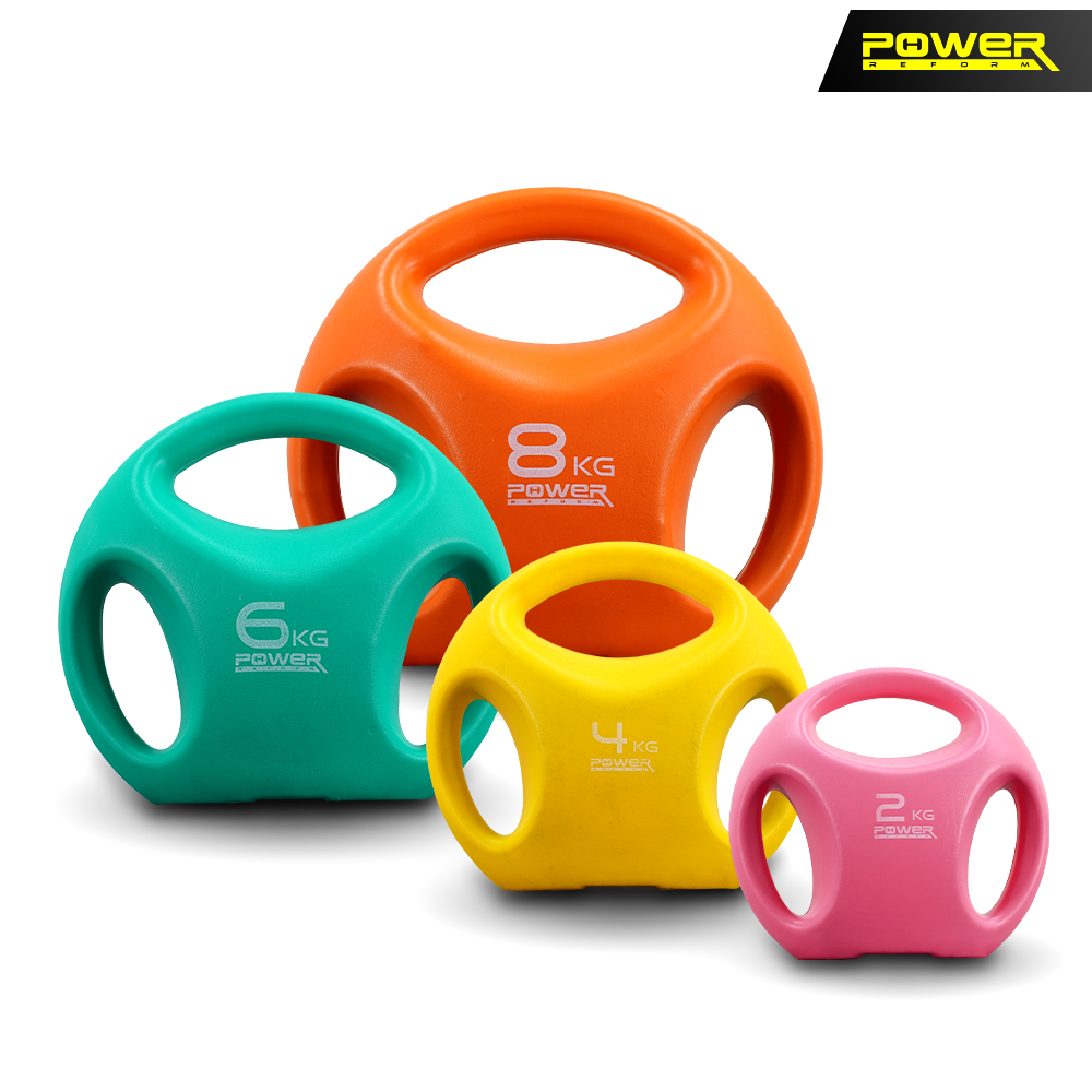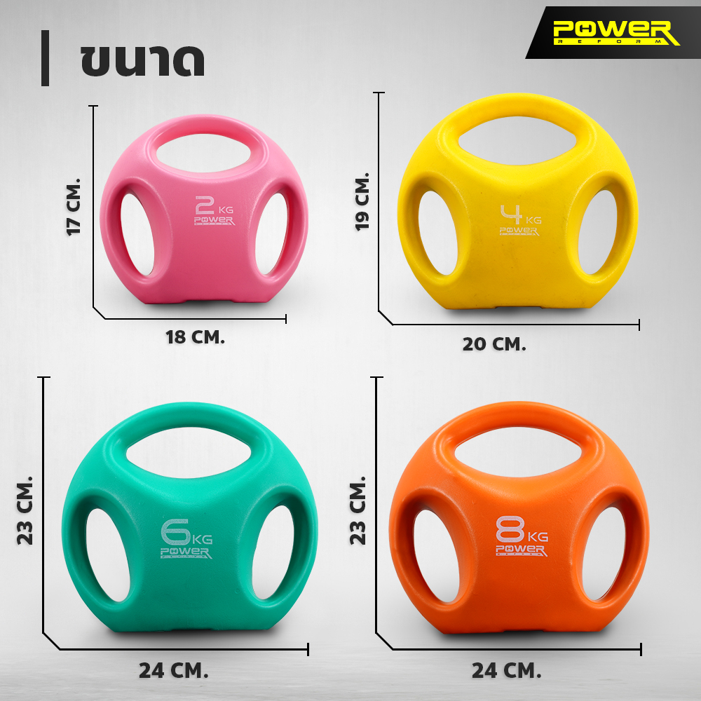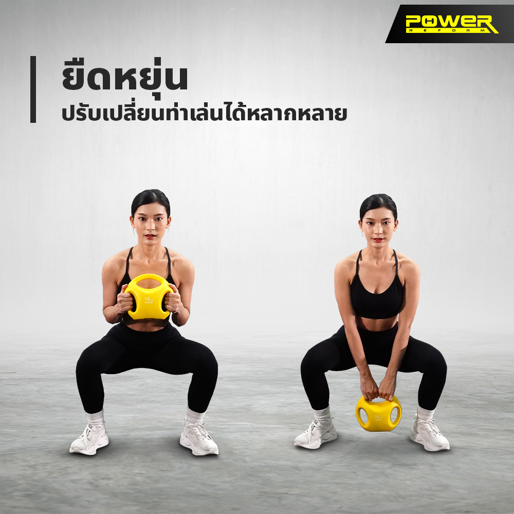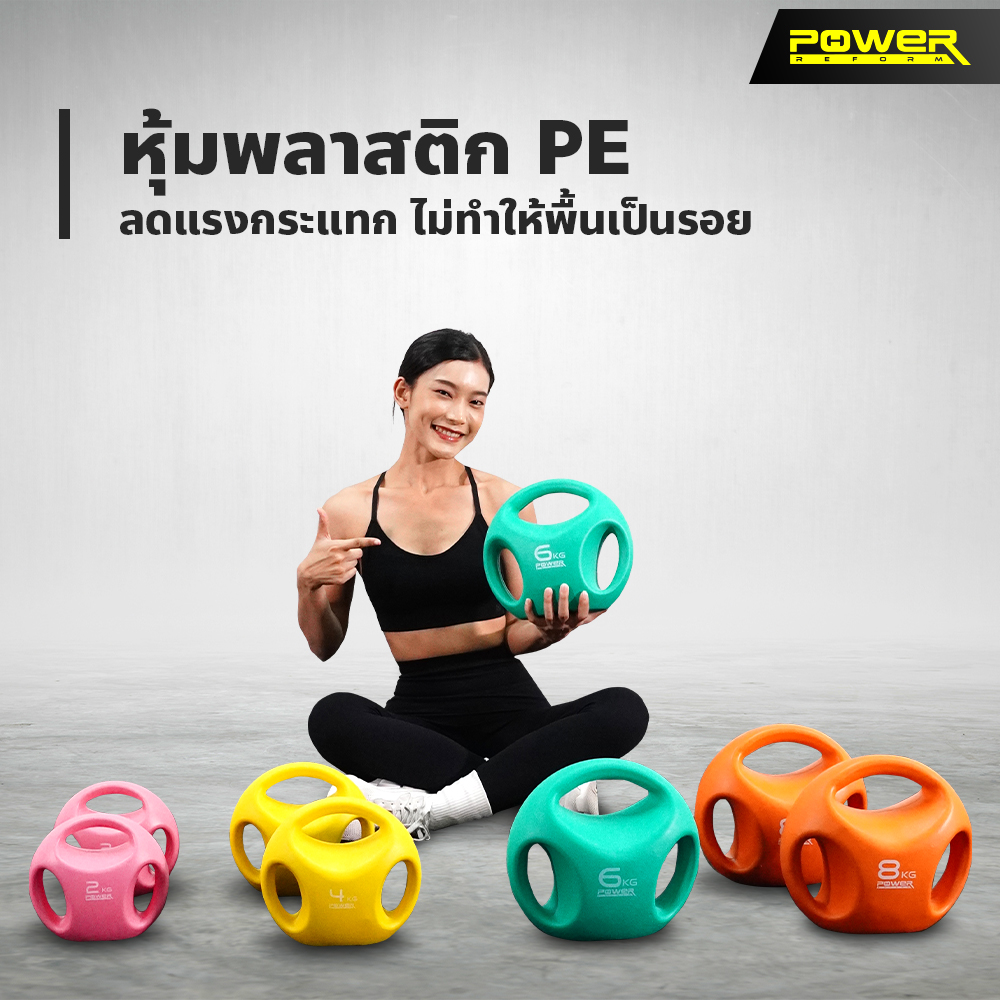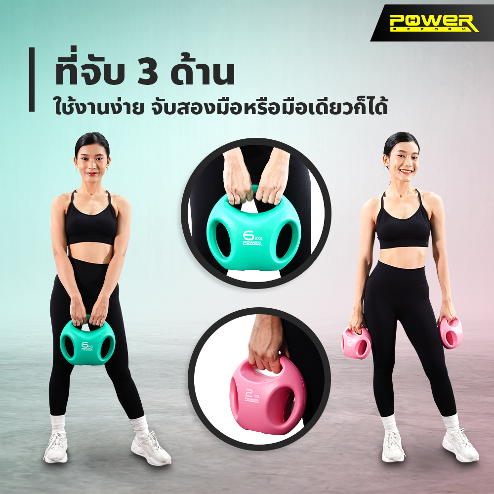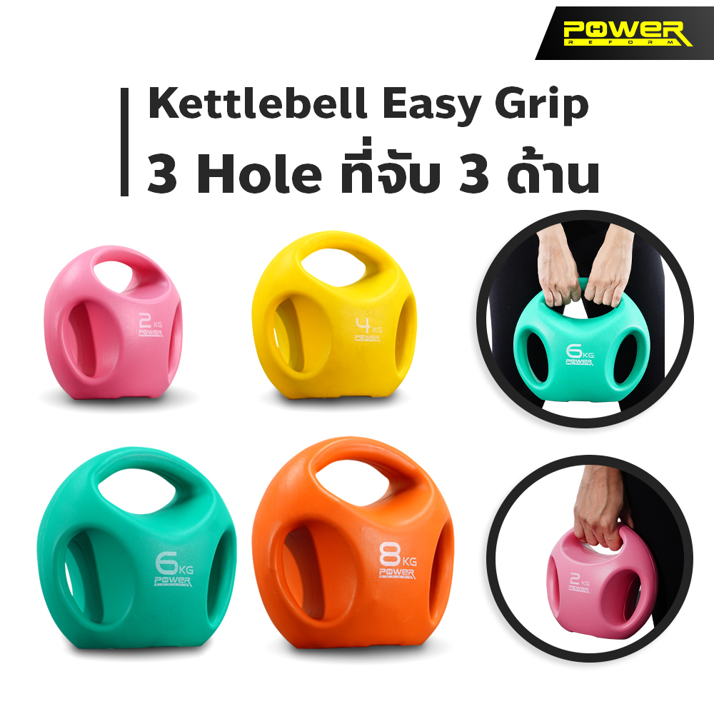 Kettlebell Easy Grip 3 Hole จาก POWER REFORM ที่จับ 3 ด้าน จับสองมือหรือมือเดียวก็ได้ ฐานแบนป้องกันการกลิ้ง วางตรงไหนก็สะดวก หุ้มพลาสติก PE ลดแรงกระแทก ไม่ทำให้พื้นเป็นรอย