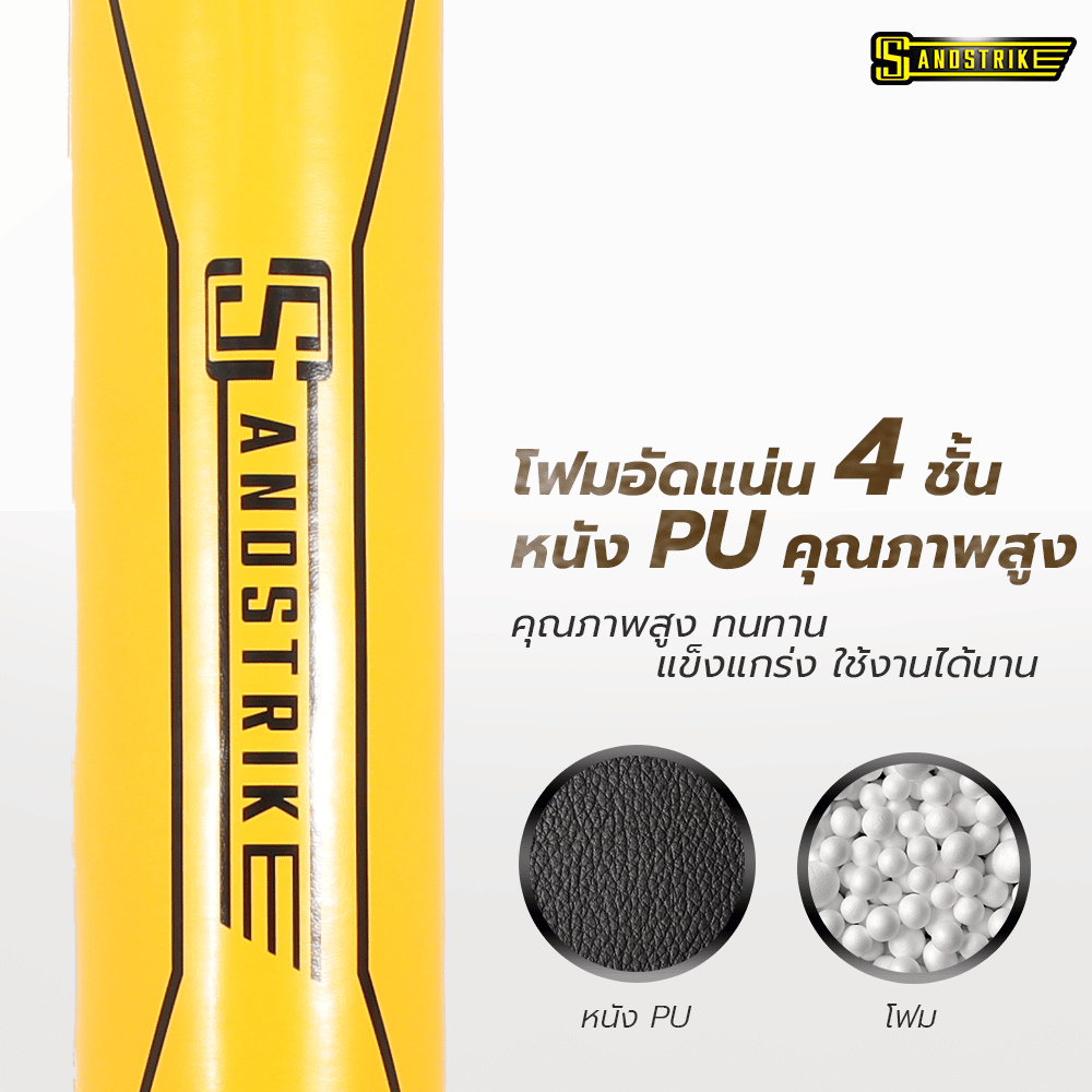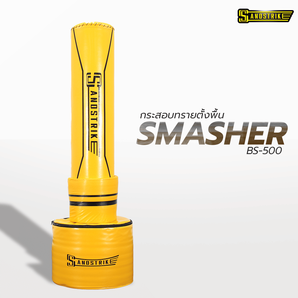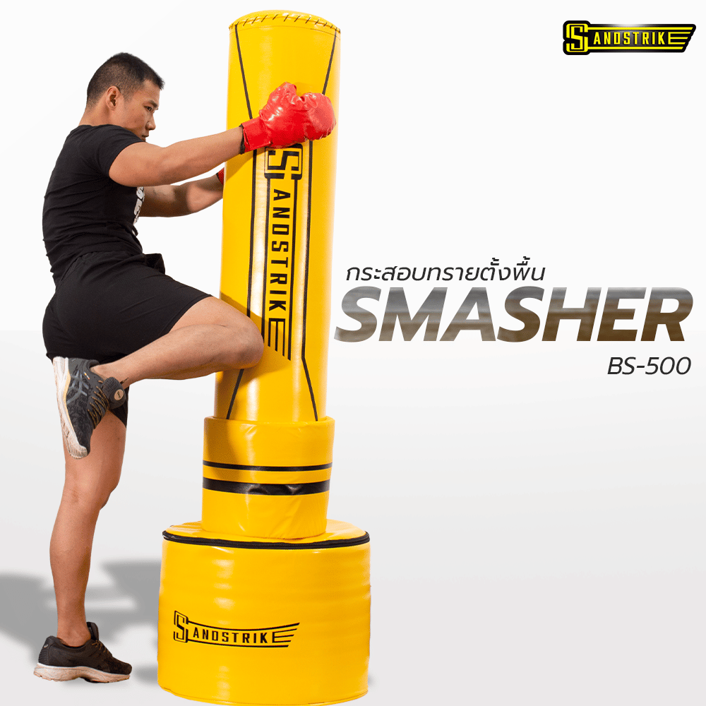 กระสอบทรายตั้งพื้น SMASHER BS-500 ผลิตจากโฟมอัดแน่น 4 ชั้น หุ้มหนัง PU ขนาด 30*175*55 ซม. มีที่หุ้มแกน ขนาด 30 ซม. หนา 2.5 ซม. ตัวดูดสูญญากาศ 12 ตัวที่ฐาน ฐานสามารถใส่น้ำหรือทรายเพื่อเพิ่มน้ำหนักได้