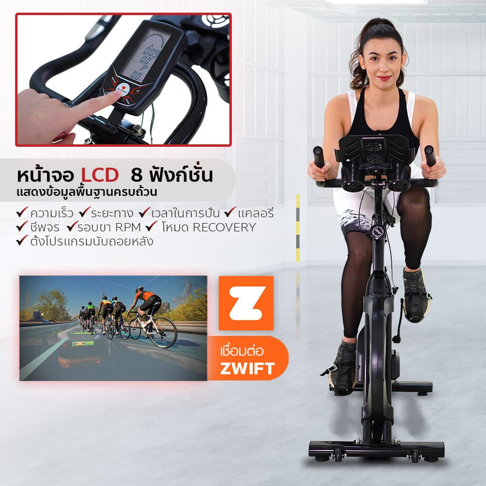 จักรยาน Spin Bike รุ่น THUNDER จาก POWER REFORM™ ขับเคลื่อนด้วยระบบสายพาน สร้างแรงต้านด้วยระบบผ้าเบรค ที่วางขวดน้ำและแทปเล็ตใหญ่พิเศษ จานล้อ Flywheel ขนาด 12 กก. รับน้ำหนักได้ 130 กก. หน้าจอ 7 ฟังก์ชั่น พร้อม วัดชีพจร วัดรอบขา RPM สามารถเชื่อมต่อเกมส์ ZWIFT ได้