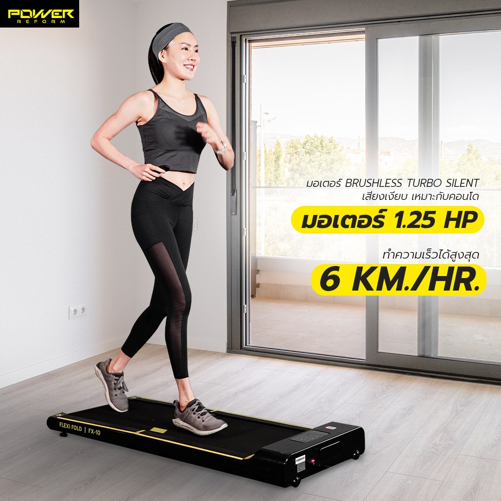 ลู่วิ่งไฟฟ้า รุ่น FX-10 Flexi Fold จาก POWER REFORM มอเตอร์ 1.25 HP ความเร็วสูงสุด 6 กม./ชม. ขนาดสายพาน 40×105 ซม. พับเก็บได้ ประหยัดพื้นที่ สามารถเชื่อมต่อแอพ ZWFIT วิ่งกับเพื่อนทั่วโลก