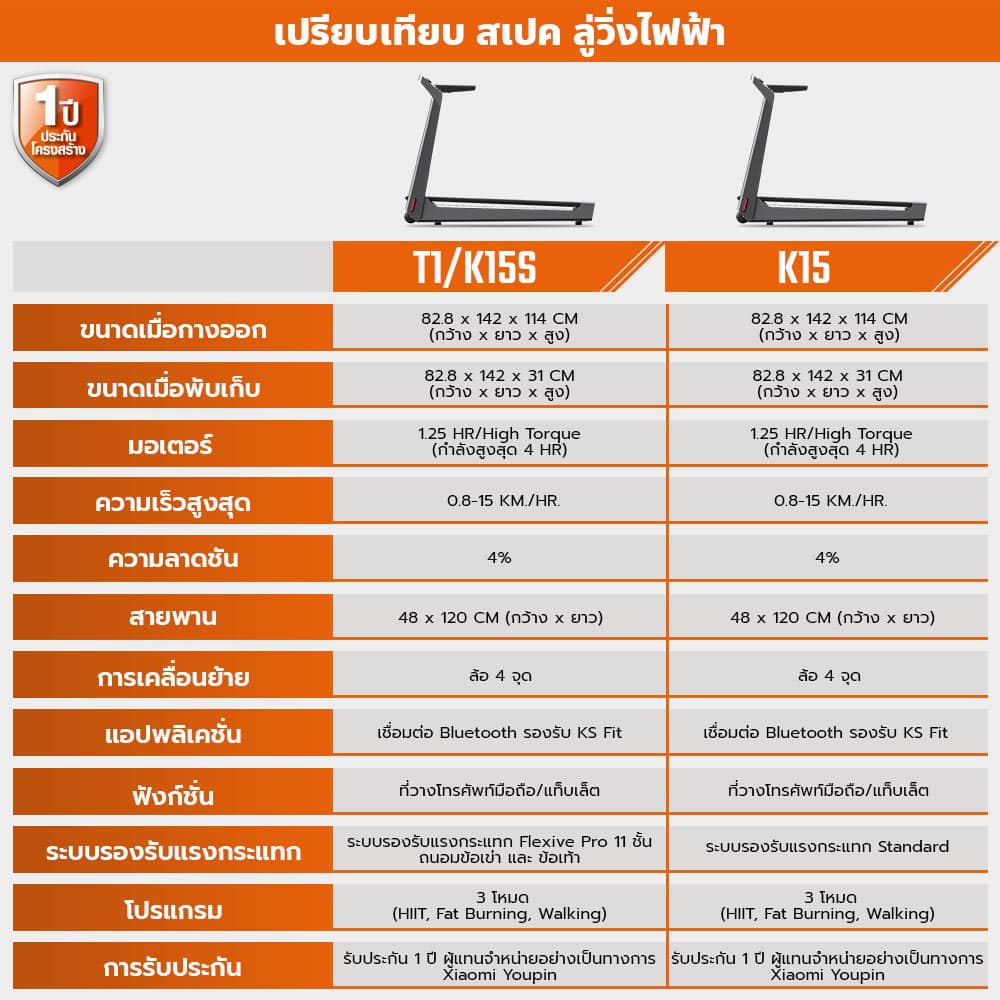ลู่วิ่งไฟฟ้า รุ่น Kingsmith T1 จาก Xiaomi™ และ FORCE Fitness ผู้แทนจำหน่ายอย่างเป็นทางการของ Xiaomi Youpin มอเตอร์ High Torque 1.25 HP พื้นที่วิ่ง มีระบบรองรับแรงกระแทก Flexive Pro 11 ชั้น ลดแรงกระแทกที่ เข่า และ ข้อเท้า ลงกว่า 80% กว้าง 48 ซม. x ยาว 120 ซม. ความเร็วสูงสุด 15 กม./ชม. สามารถพับเก็บพิงกำแพงได้ 90 องศา พับเก็บได้มีล้อเลื่อน เป็น Global Version ปลั๊กไทย ไฟไทย คู่มือภาษาอังกฤษ เชื่อมต่อ KS Fit ได้