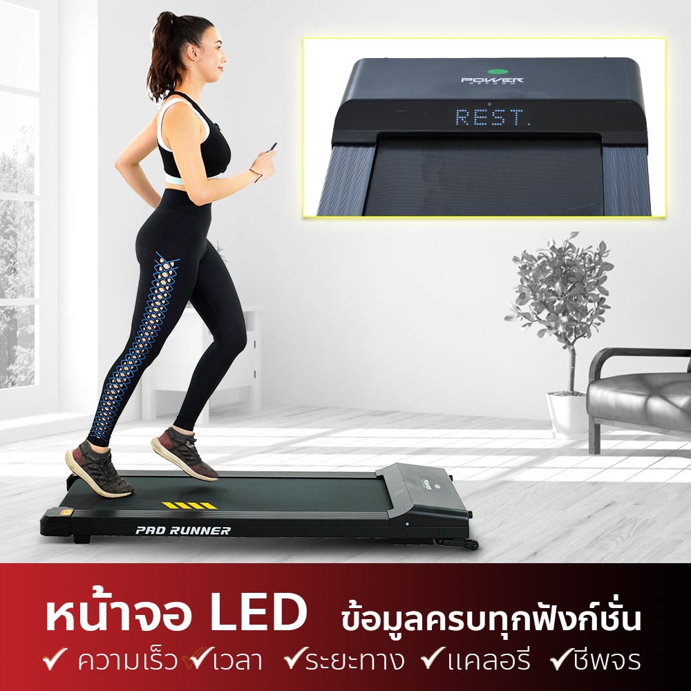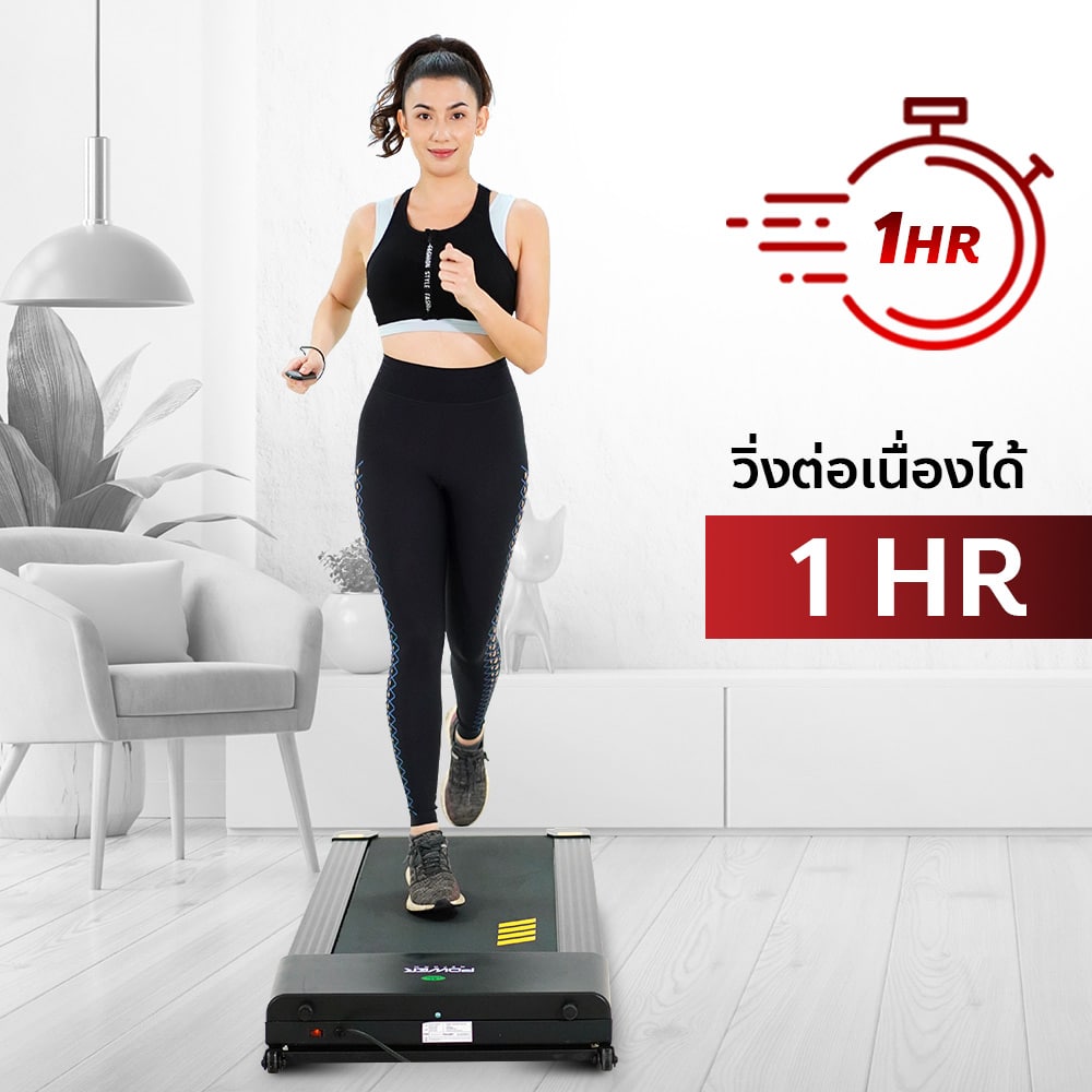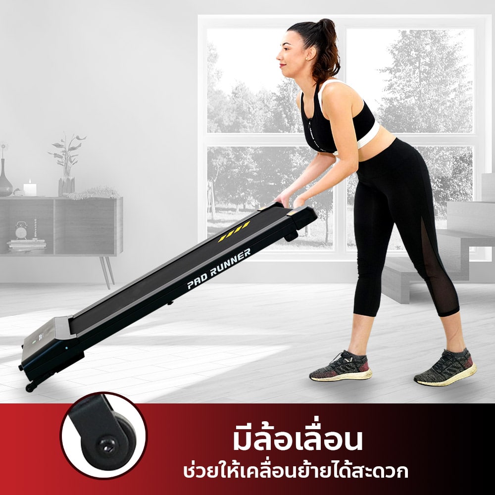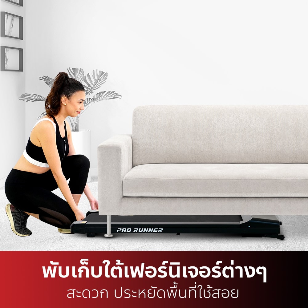 ลู่วิ่งไฟฟ้า รุ่น PAD RUNNER จาก POWER REFORM™ มอเตอร์ DC 1.5 แรงม้า พื้นที่วิ่ง กว้าง 41 ซม. x ยาว 115 ซม. ความเร็วสูงสุด 6 กม./ชม. รับน้ำหนัก 100 กก. พับเก็บแนวตั้ง 90 ํ ประหยัดพื้นที่ใช้สอย **หลังใช้งาน 1 ชั่วโมง ให้พักเครื่อง 10-15 นาที ก่อนเพื่อยืดอายุการใช้งาน**