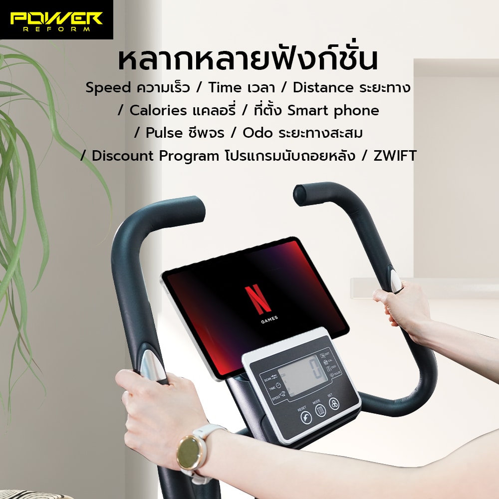 จักรยานนั่งปั่น รุ่น PARAGON จาก POWER REFORM™ จานปั่น 5 กก. ปรับแรงต้านได้ 8 ระดับ ระบบแม่เหล็ก นุ่ม เงียบ ลดแรงกระแทกที่ข้อขา ข้อเข่า ระยะก้าว 14.5 นิ้ว เบาะนั่งใหญ่พิเศษ นุ่ม นั่งสบาย เชื่อมต่อ ZWIFT ได้