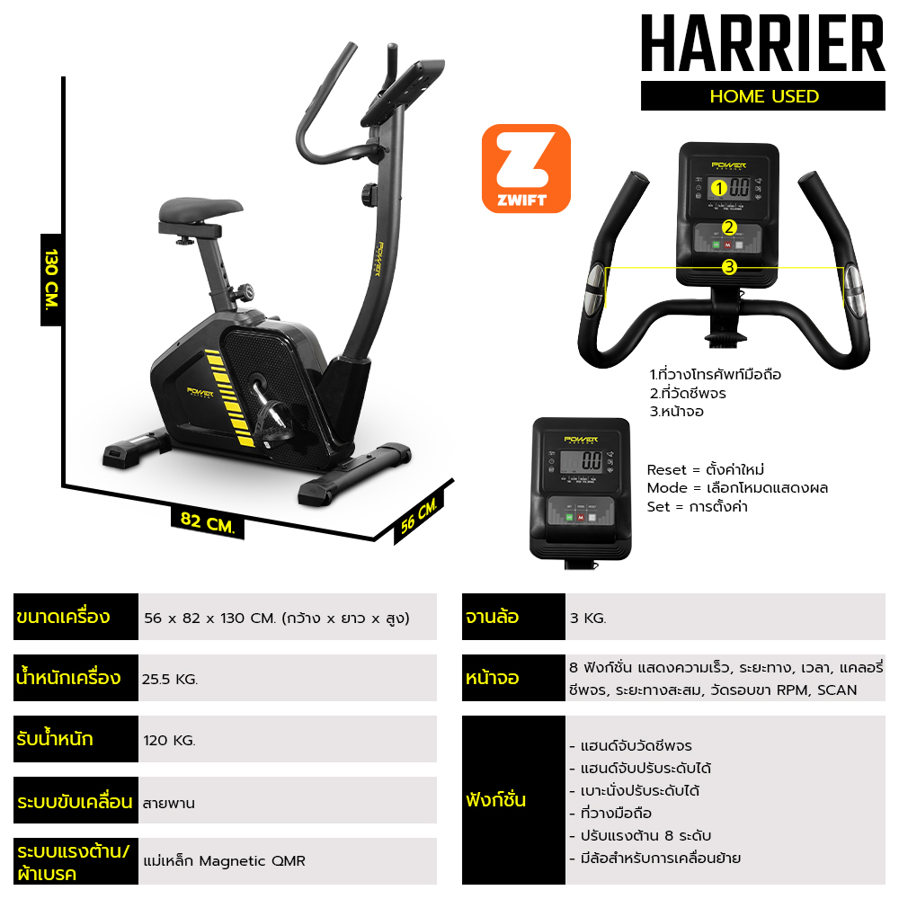 จักรยานนั่งปั่น รุ่น Harrier จาก POWER REFORM จานล้อ 3 กก. ระบบแม่เหล็ก QMR เสียงเงียบ ระบบการปั่น 2 Way สามารถปั่นได้ทั้งหน้า-หลัง ปรับแรงต้านได้ 8 ระดับ หน้าจอ 7 ฟังก์ชั่น สามารถเชื่อมต่อแอพ ZWIFT เพื่อเล่นเกมส์กับเพื่อนทั่วโลกได้