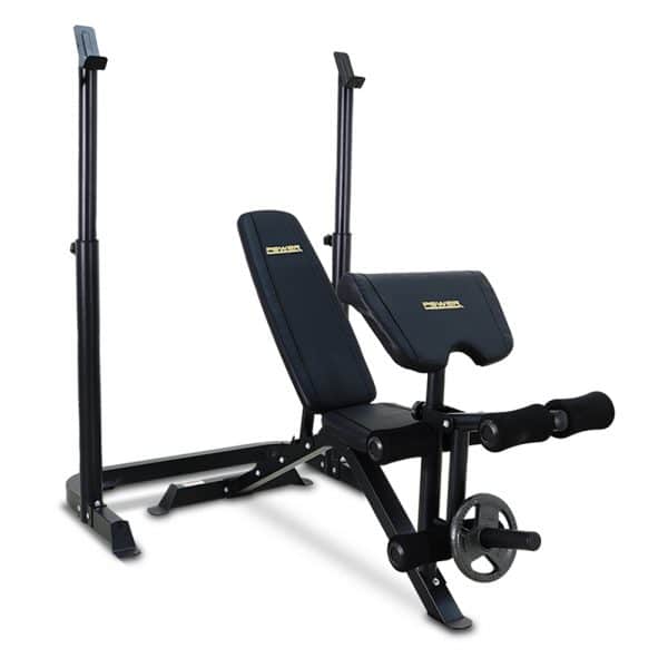 เก้าอี้ยกน้ำหนัก พร้อมแร็ควางบาร์เบล รุ่น HERO จาก POWER REFORM รองรับการเล่น อกบน อกกลาง อกล่าง เบาะหลังปรับได้ 6 ระดับ มีเบาะเล่นหน้าแขน Bicep Curl และ ที่เล่นขา Leg Extension และ Leg Curl รับน้ำหนักได้ 180 กก.