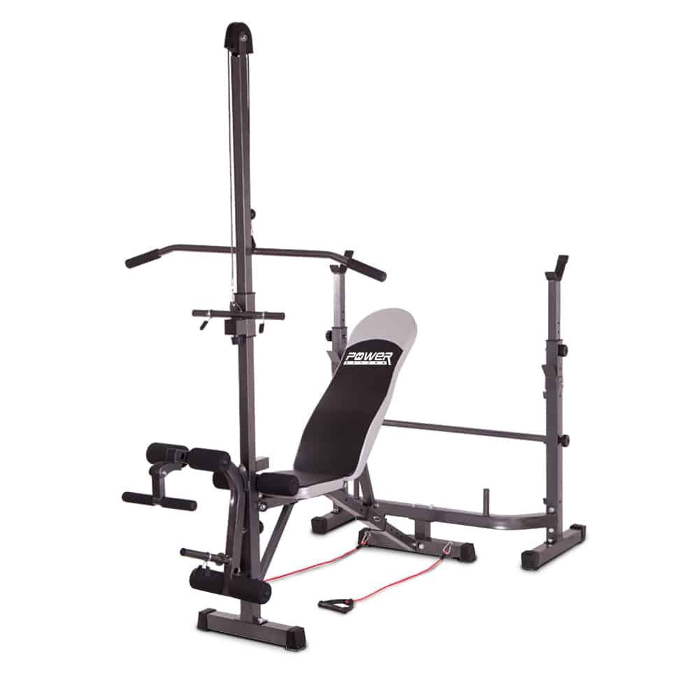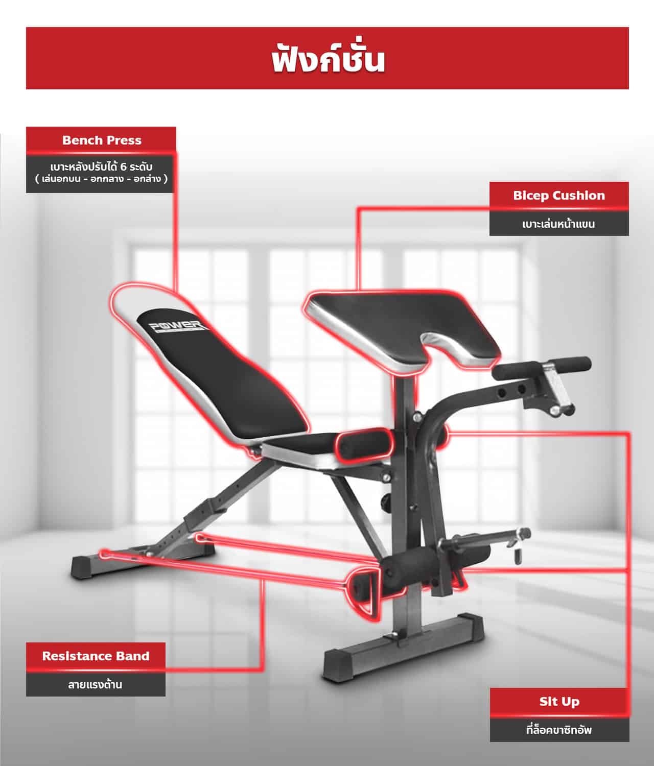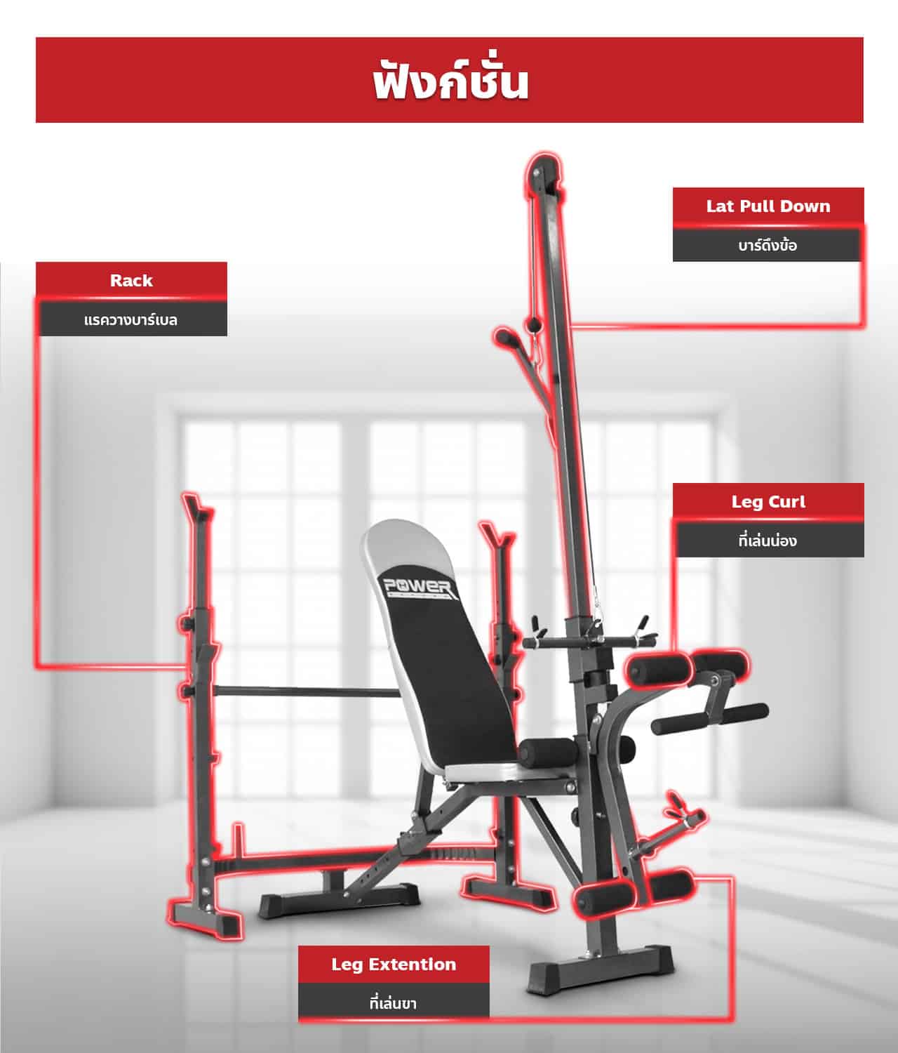 ม้ายกน้ำหนัก พร้อม ชั้นวางบาร์เบล รองรับ อกบน อกกลาง อกล่าง ซิทอัพ มี Lat Pull Down เบาะเล่นหน้าแขน Bicep Preacher Curl ที่เล่นขา Leg Curl และ Leg Extension