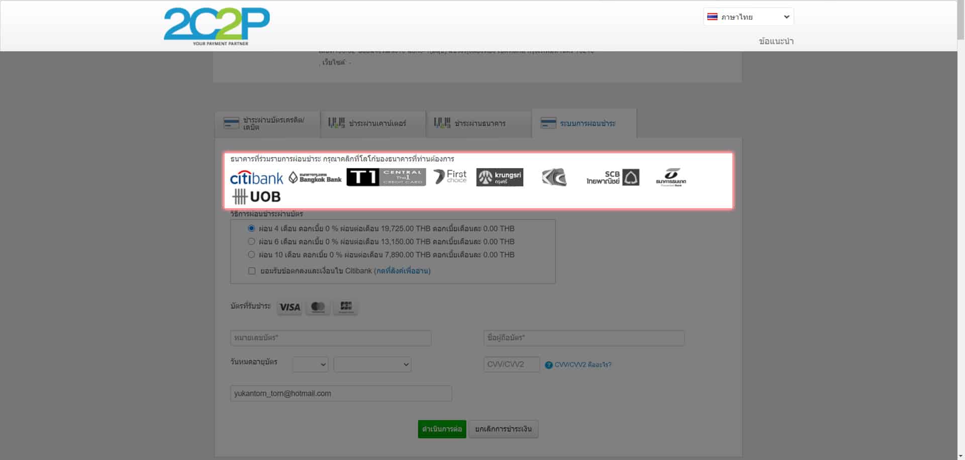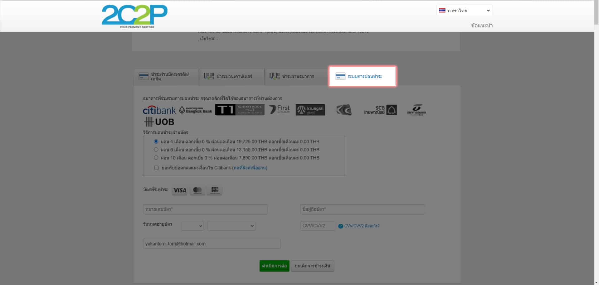 3. เลือก ชำระผ่านบัตรเครดิต ทำการกรอกข้อมูลบัตรเครดิตให้เรียบร้อย แล้วเลือกดำเนินการต่อ