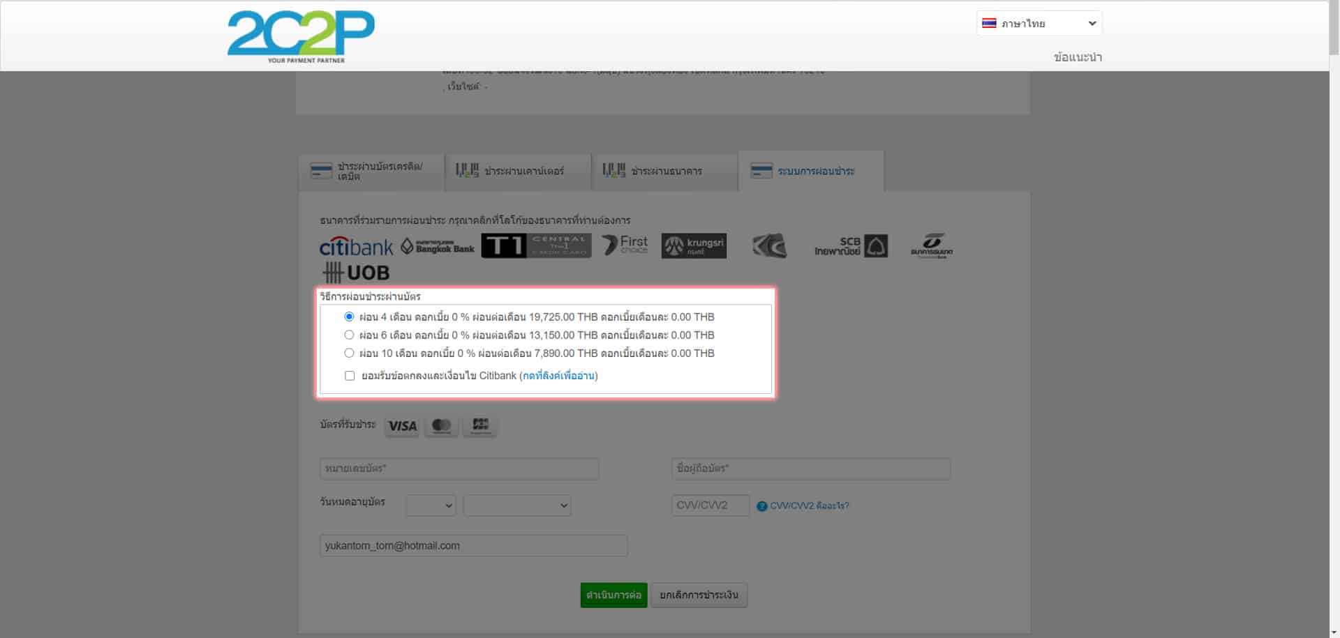 5. เลือก วิธีการผ่อนชำระผ่านบัตร โดยเลือกจำนวนเดือนที่ต้องการผ่อนชำระตามต้องการ