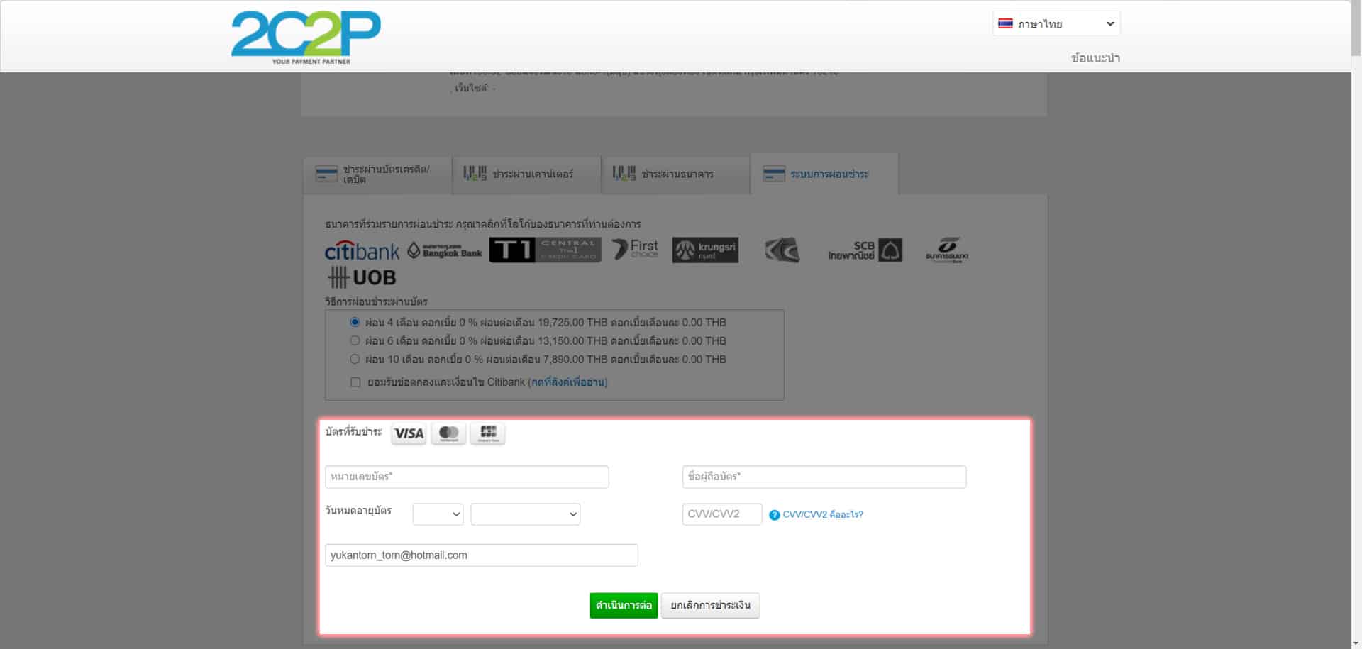 6. ใส่ข้อมูลบัตรเครดิตให้ถูกต้องครบถ้วน แล้วกด ดำเนินการต่อ